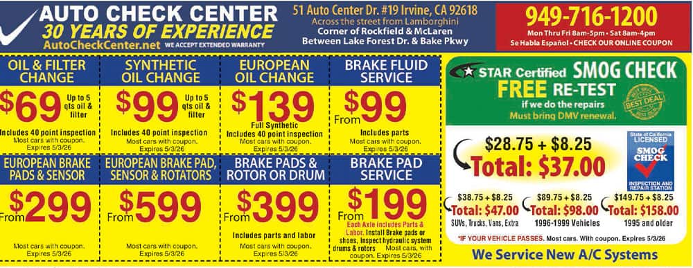 Auto Check Center Irvine, CA is an Auto Repair Shop and STAR Certified Smog Check & Repair Station. We offer complete Auto Repair, auto electrical work and complete auto troubleshooting for domestic and foreign cars. Auto Check Center Auto repair includes: